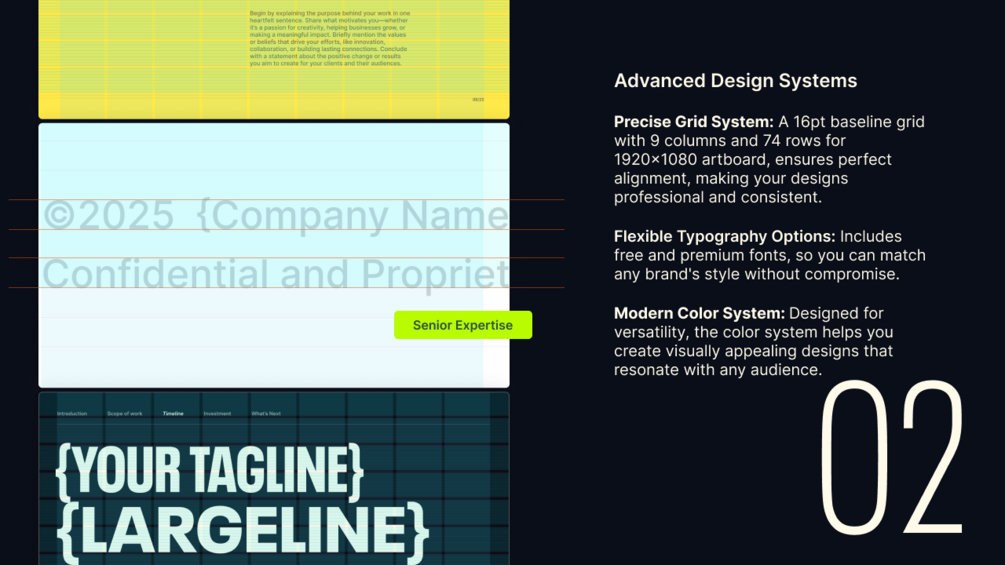 - Clean and Precise Systems: Organized layers, a 16pt baseline grid system, and modern typography options.